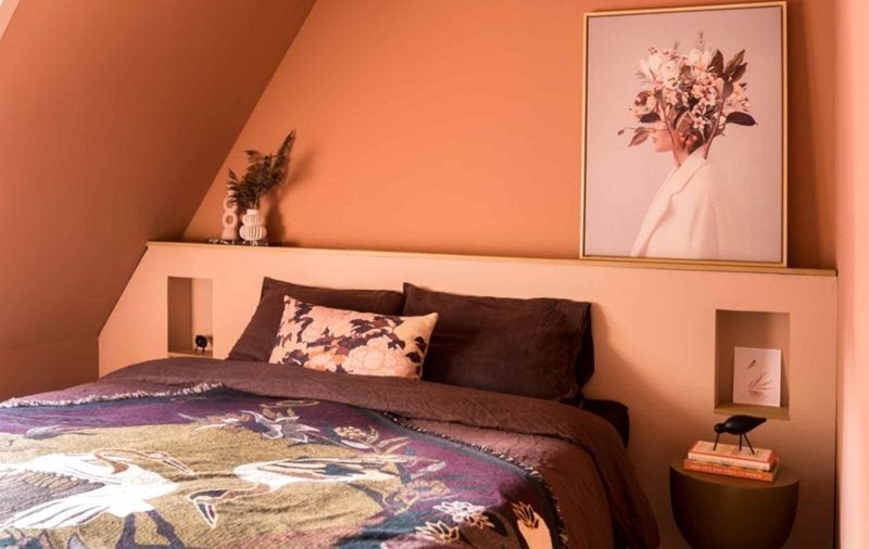 De combinatie van lichte en donkere kleuren zorgen voor diepte en contrast. Hoewel je misschien geneigd bent om lichte kleuren te kiezen in een donkere ruimte, hoeft dat niet altijd de beste keus te zijn. In een slaapkamer vind ik het zelf altijd mooi om te werken met een donkere kleur als basis. In mijn slaapkamer zie je dit terug in de kleur Light Cherry Parade. Hoewel er ‘light’ in de kleurnaam zit, is dit geen hele lichte kleur. Juist door een net wat donkerdere kleur te kiezen, krijg je het gevoel dat de ruimte je omarmt als je binnen komt. Wanneer je het plafond ook mee schildert, ontstaat minder contrast met de wanden. Dit zorgt voor een geborgen gevoel.