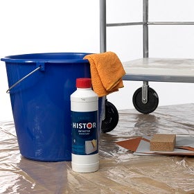 Verf hecht het beste op een schoon en vetvrij oppervlak. Maak het behang daarom goed schoon en stofvrij. Gebruik hiervoor warm water met daarin Histor Ontvetter. Zorg dat de ruimte goed geventileerd is, maar zonder tocht. Een temperatuur van rond de 20°C is ideaal. Dek de vloer af met kranten of afdekfolie. Plak alles wat je niet wilt schilderen af met afplaktape.