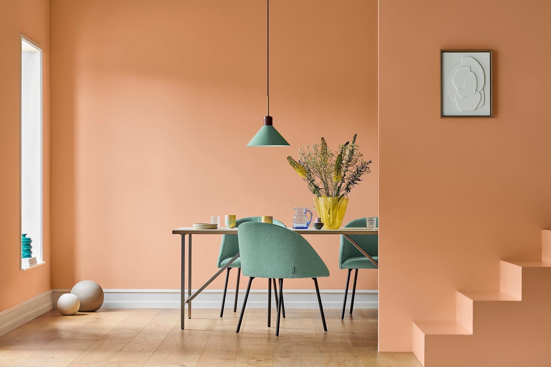 Dit uitbundige palet van felle, heldere pasteltinten en sterke neutrale kleuren biedt een overvloed aan contrast. De veelzijdige kleur Vining Ivy zorgt binnen dit thema voor zowel een glamoureuze retrostijl als een frisse, moderne sfeer. Afwerkingen in mat, glanzend of metallic geven met getinte verlichting een surrealistisch gevoel. Het gebruik van neutrale kleuren maakt de combinaties eleganter en tempert de krachtige kleuraccenten. Een 60-30-10-suggestie van Histor: de oranje pastel Citrus Sachet (PPG1198-3) als basis gecombineerd met het zomerse zachtgeel van Sightseer (PPG1210-3) en de zeetint Crystal Oasis (PPG1138-3) voor accessoires.