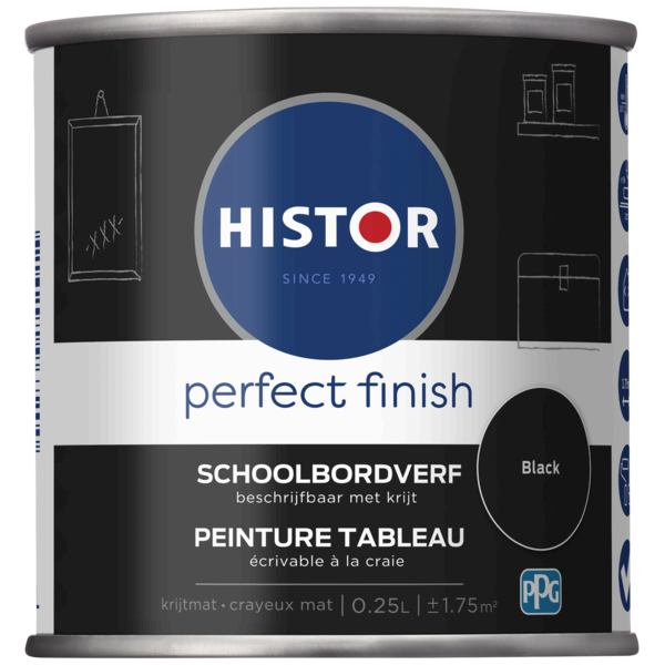 Histor Perfect Finish Schoolbordverf heeft een hoge dekkracht en hecht goed op geschilderd werk. Schoolbordverf is geschikt voor zowel muren als houtwerk en is aangebracht goed beschrijfbaar met schoolkrijt.