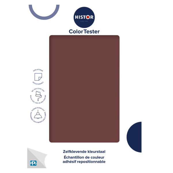 Met de Histor ColorTester test je jouw kleur eenvoudig op de muur. De zelfklevende kleurstaal is makkelijk te verplaatsen en ook weer van je muur af te halen. Beoordeel de kleur van alle kanten, op verschillende momenten van de dag en in ieder licht. Gemaakt met 100% echte verf en daarmee kleurecht.