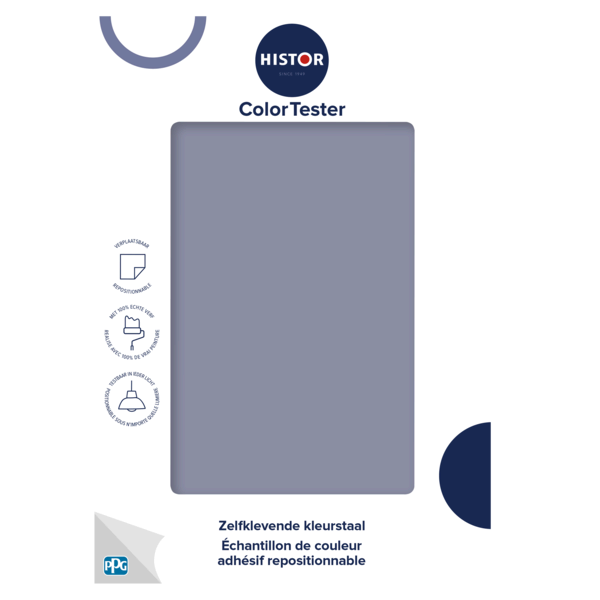 Met de Histor ColorTester test je jouw kleur eenvoudig op de muur. De zelfklevende kleurstaal is makkelijk te verplaatsen en ook weer van je muur af te halen. Beoordeel de kleur van alle kanten, op verschillende momenten van de dag en in ieder licht. Gemaakt met 100% echte verf en daarmee kleurecht.