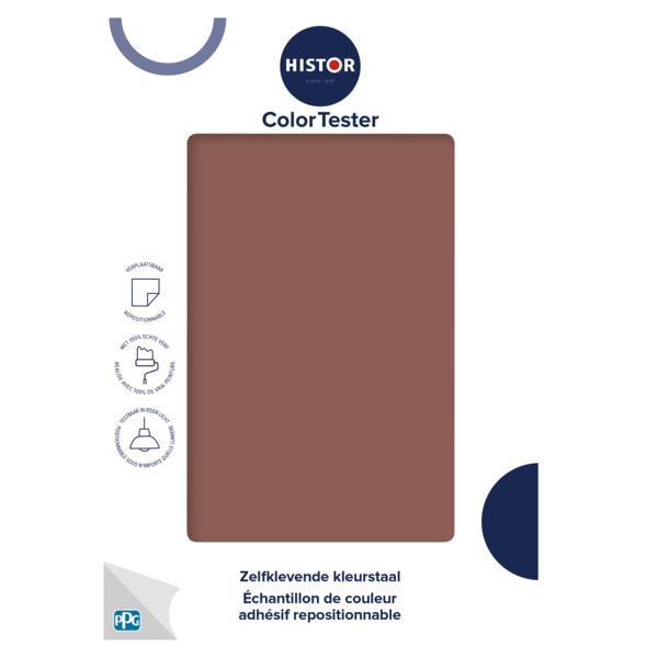 Met de Histor ColorTester test je jouw kleur eenvoudig op de muur. De zelfklevende kleurstaal is makkelijk te verplaatsen en ook weer van je muur af te halen. Beoordeel de kleur van alle kanten, op verschillende momenten van de dag en in ieder licht. Gemaakt met 100% echte verf en daarmee kleurecht.