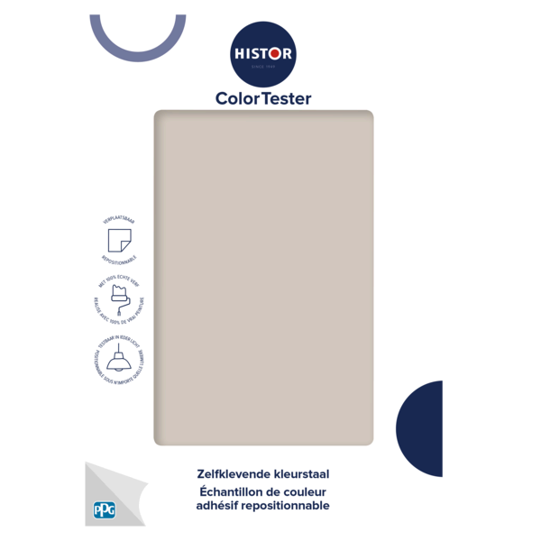 Met de Histor ColorTester test je jouw kleur eenvoudig op de muur. De zelfklevende kleurstaal is makkelijk te verplaatsen en ook weer van je muur af te halen. Beoordeel de kleur van alle kanten, op verschillende momenten van de dag en in ieder licht. Gemaakt met 100% echte verf en daarmee kleurecht.