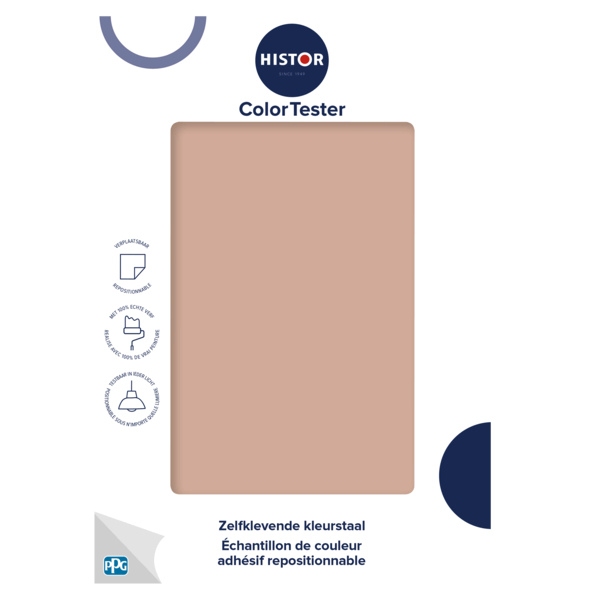 Met de Histor ColorTester test je jouw kleur eenvoudig op de muur. De zelfklevende kleurstaal is makkelijk te verplaatsen en ook weer van je muur af te halen. Beoordeel de kleur van alle kanten, op verschillende momenten van de dag en in ieder licht. Gemaakt met 100% echte verf en daarmee kleurecht.