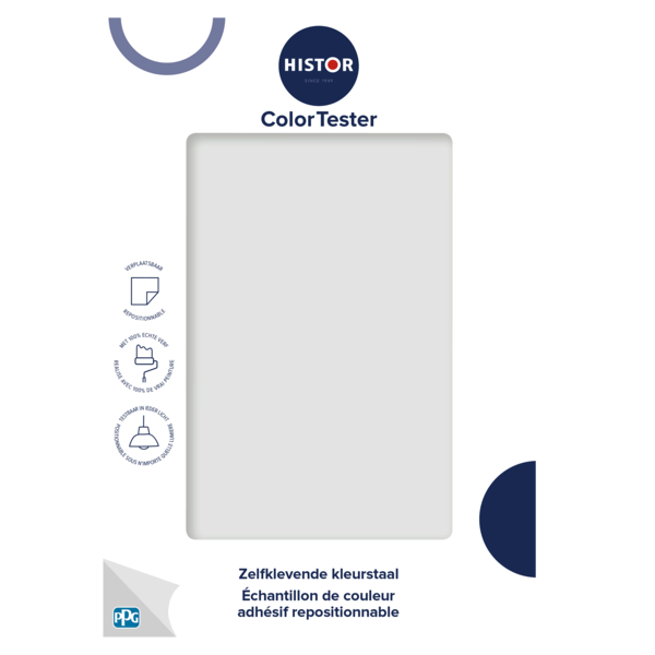 Met de Histor ColorTester test je jouw kleur eenvoudig op de muur. De zelfklevende kleurstaal is makkelijk te verplaatsen en ook weer van je muur af te halen. Beoordeel de kleur van alle kanten, op verschillende momenten van de dag en in ieder licht. Gemaakt met 100% echte verf en daarmee kleurecht.